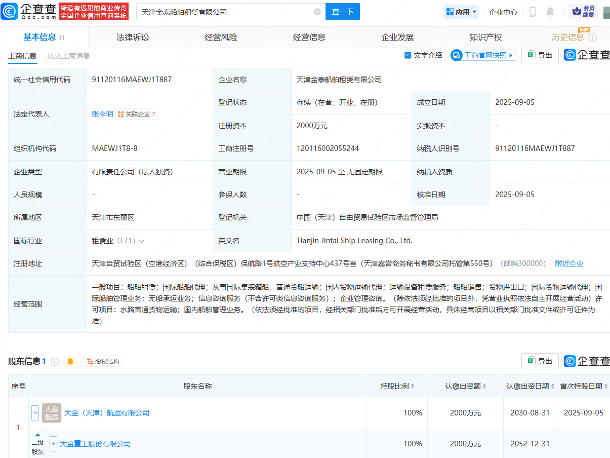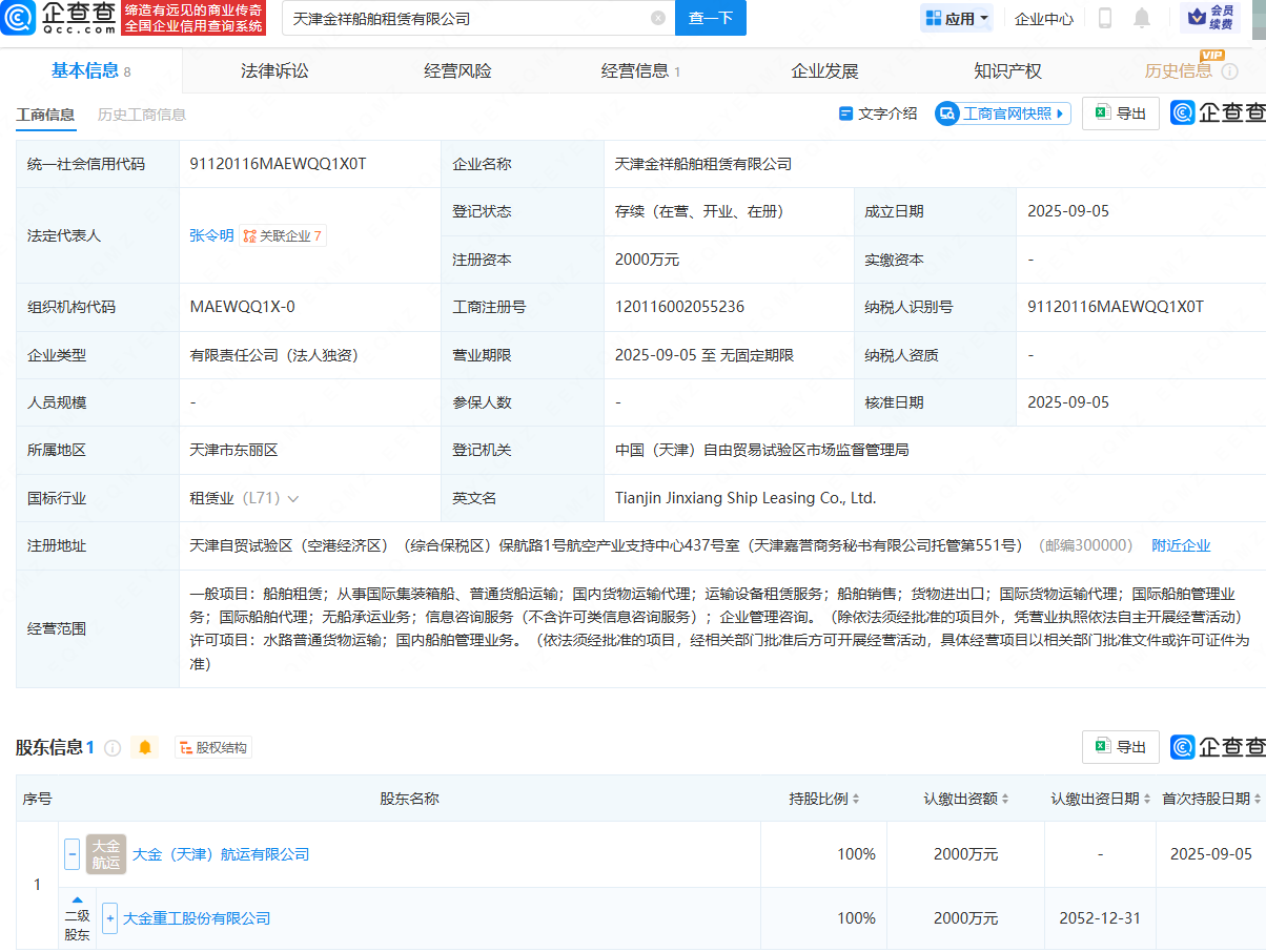 近日,天津金祥船舶租赁有限公司、天津金泰船舶租赁有限公司成立,法定代表人均为张令明,注册资本均为2000万元,经营范围均包含:船舶租赁;从事国际集装箱船、普通货船运输;国内货物运输代理;船舶销售;货物进出口等。企查查股权穿透显示,两公司均由大金重工(002487)间接全资持股。